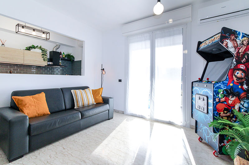 - Living area with a sofa bed, perfect for relaxing or accommodating 2 additional guests. Includes an arcade cabinet with over 800 free games.